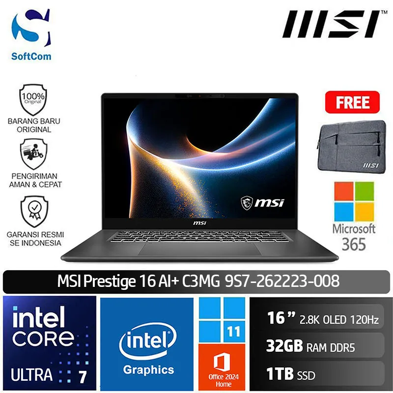 MSI Prestige 16 AI+ C3MG (9S7-262223-008) /Intel Core 7-355/32GB/1TB SSD/16″ 2.8K OLED 120Hz/Win 11 Home+OHM 2024+M365/Platinum Gray