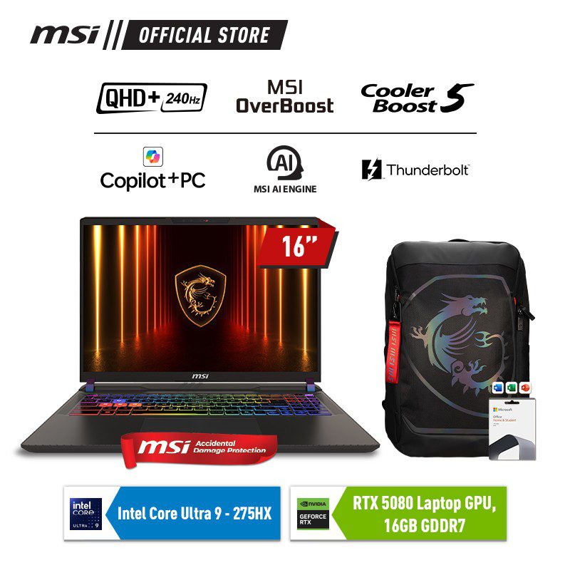 MSI Vector 16 HX AI A2XWIG (9S7-15M352-043) /Ultra 9-275HX/16GB/1TB SSD/GeForce RTX 5080 16GB/16″ QHD+ IPS 240Hz/Win 11 Home+OHM 2024/Cosmos Gray